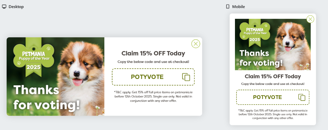 • Introduced website popups and remarketing campaigns to target people who voted or visited petmania.ie/petmania-puppy-of-the-year/